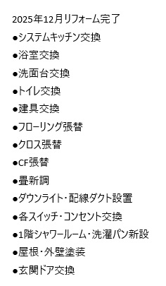 公営水道、公共本下水、都市ガス、角地、南道路、改装済み(2025年12月完了)