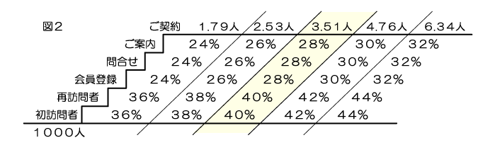 上にいるお客さまほど弊社との信頼関係は強いということ。 上にいるお客さまほど契約は近いということです。 私は、お客さまがこの階段を上りやすいような営業方法を意識しています。 イメージとして大切なのは、お客さまが自分の意思で階段を上ってくれること。 そのためには、お客さまが求める情報をタイミングよく伝えることです。 決して営業する側が伝えたい情報を前面に押し出さないことが大切だと思います。 2.確率で考える初アクセスから契約への階段 購入して下さるお客様が上ってくる階段を確率の面から考えてみます。